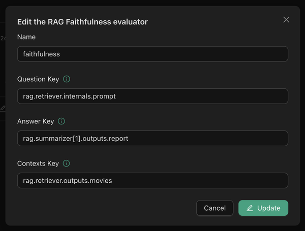 From the trace we saw before, we could say that answer maps to the second rag summarizer output report, denoted by rag.summarizer[1].outputs.report. Similarly, the contexts map to the rag retriever output movies, denoted by rag.retriever.outputs.movies.