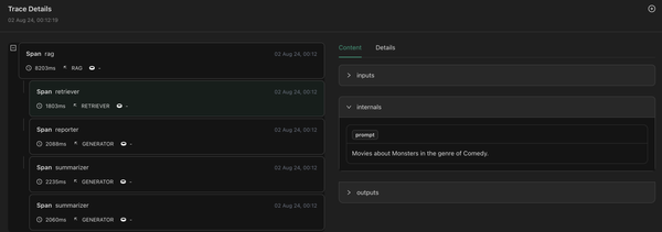Upon clicking on view trace, you should be able to see the inputs and outputs for each instrumented stage in the RAG workflow.