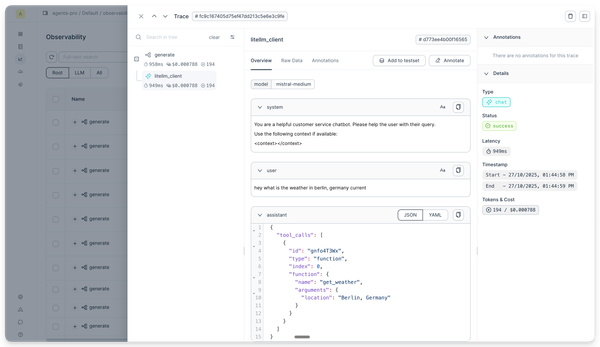 • Debug Effectively: View exact prompts sent and contexts retrieved. For complex workflows like agents, you can trace the data flow and quickly identify root causes.